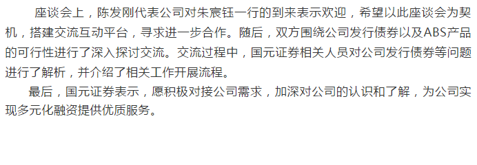 國元證券公司結(jié)構(gòu)融資部總經(jīng)理朱宸鈺一行蒞臨公司交流座談