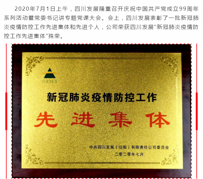 公司榮獲四川發(fā)展“新冠肺炎疫情防控工作先進(jìn)集體”榮譽(yù)稱號(hào)