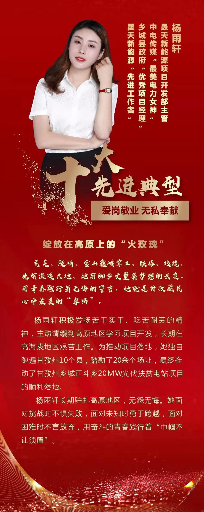 楊雨軒同志自入職以來,長期駐扎高原地區(qū),吃苦耐勞、兢兢業(yè)業(yè)。為推動項目落地,她獨自跑遍甘孜州10個縣,踏勘了20余個場址,最終推動了甘孜州鄉(xiāng)城正斗鄉(xiāng)20MW光伏扶貧電站項目的順利落地。她用腳步丈量著人生的長度,用青春踐行著無悔的誓言。