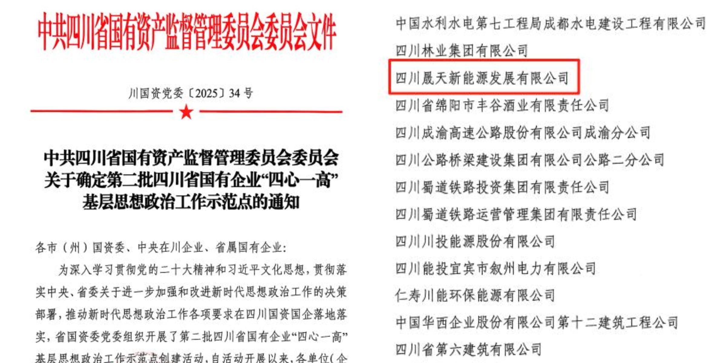 近日,四川省國(guó)資委黨委印發(fā)《關(guān)于確定第二批四川省國(guó)有企業(yè)“四心一高”基層思想政治工作示范點(diǎn)的通知》,確定56個(gè)單位為第二批四川省國(guó)有企業(yè)“四心一高”基層思想政治工作示范點(diǎn),其中晟天新能源獲此殊榮,既是對(duì)公司思想政治工作成效的高度認(rèn)可,更是激勵(lì)鞭策公司持續(xù)深耕實(shí)干的強(qiáng)大動(dòng)力。